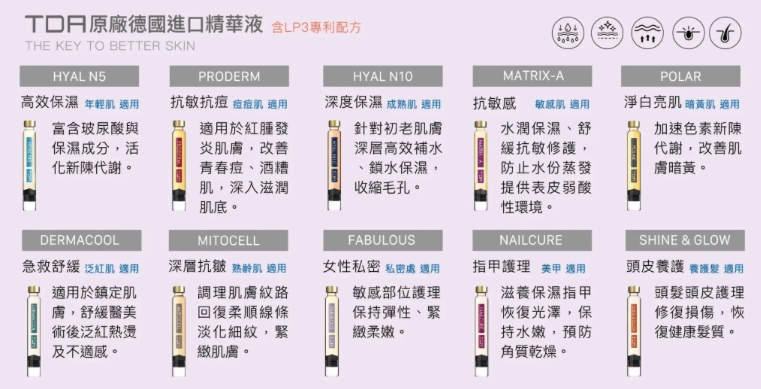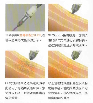 TDA精華富含LP3活性成分,能短暫打開皮膚細胞間的縫隙,再利用高壓高速的噴射方式,使TDA精華液能深入皮膚深層,實現更有效的滲透與吸收。